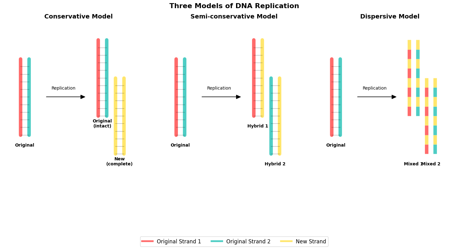 By the mid-1950s, scientists had three different ideas about how DNA might copy itself.5 It’s fascinating to think that even after Watson and Crick proposed the double helix structure, nobody actually knew how it worked! The three theories had pretty descriptive names that tell you exactly what each one predicted.