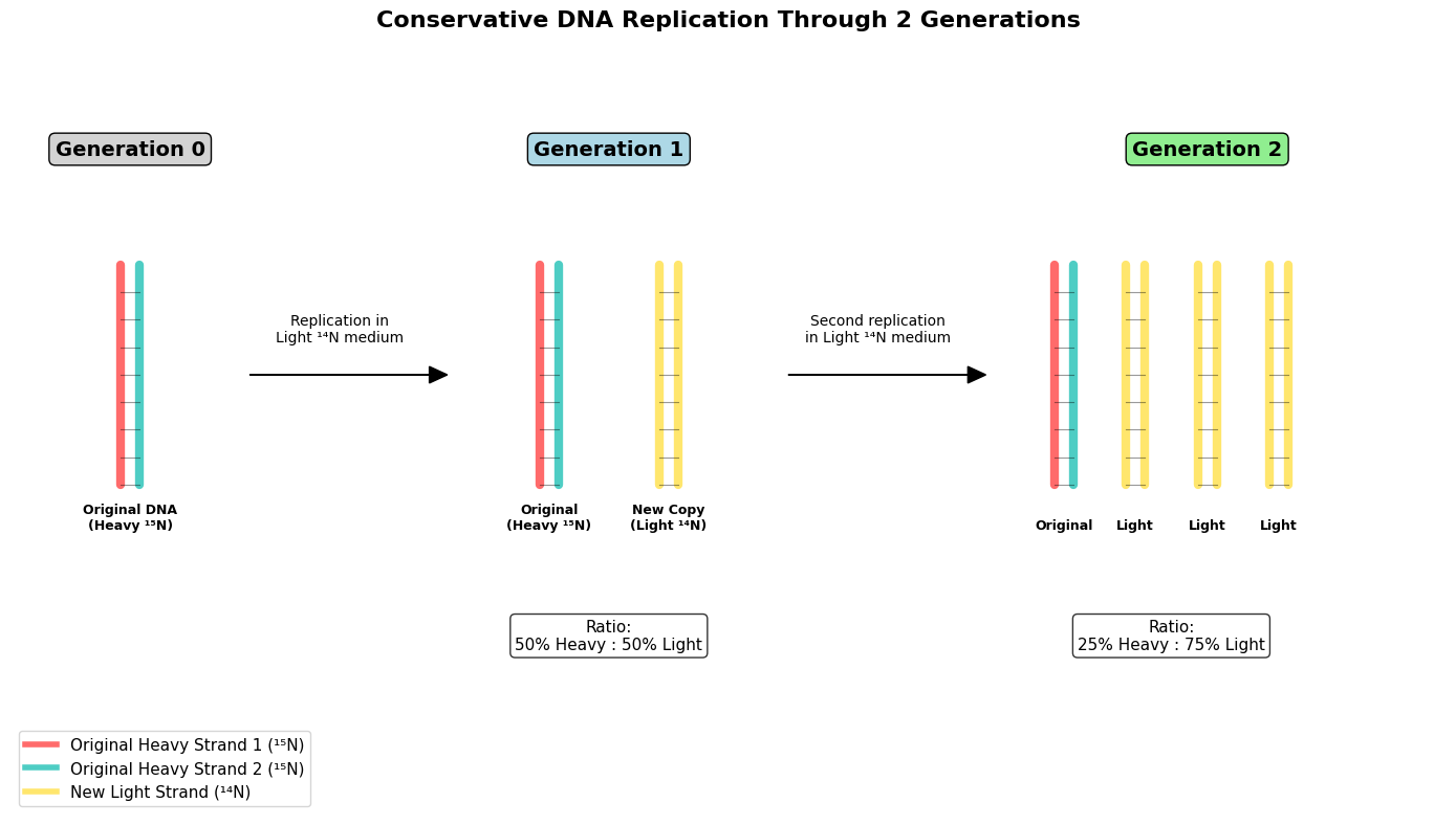 Generation 1 (after one replication in light medium): This was the moment of truth. They saw a single band, but it wasn’t at the heavy position or the light position. It was right in the middle at an intermediate density!18 This immediately ruled out the conservative model. If DNA replication were conservative, they would have seen two separate bands, not one intermediate band.