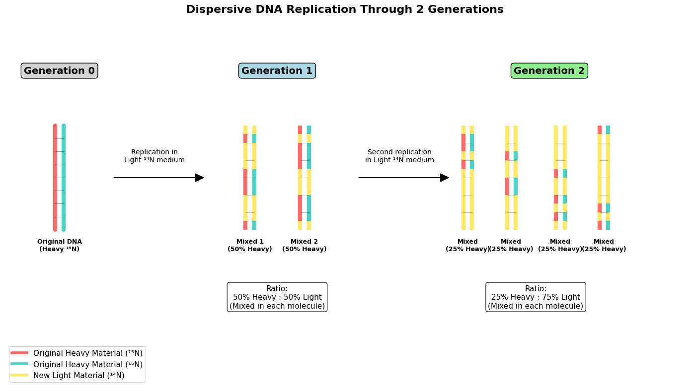 In dispersive DNA replication, DNA is chopped up into little pieces but they still remain as double strand. In generation 1, random pieces of DNA are replaced with light ones. Therefore, we have 50% heavy and 50% light hybrids in generation 1. And in generation 2, we have 25% heavy with 75% light as hybrids.