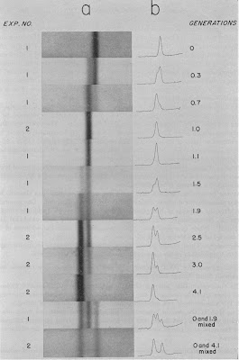 Generation 0 (the control): All the DNA was heavy, forming a single band at the bottom of the cesium chloride gradient.17 This made sense because the bacteria had been growing in heavy nitrogen for many generations.