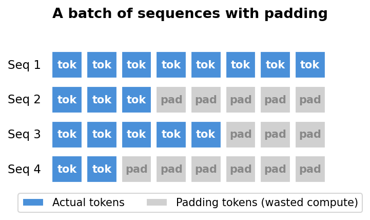 When you create a batch of sequences for training, they need to be the same length. But real data has sequences of all different sizes. PyTorch’s dataloader solves this by padding shorter sequences with special padding tokens to match the longest one in the batch. The problem is that the model still processes all those padding tokens, wasting compute on tokens that don’t contribute to learning.